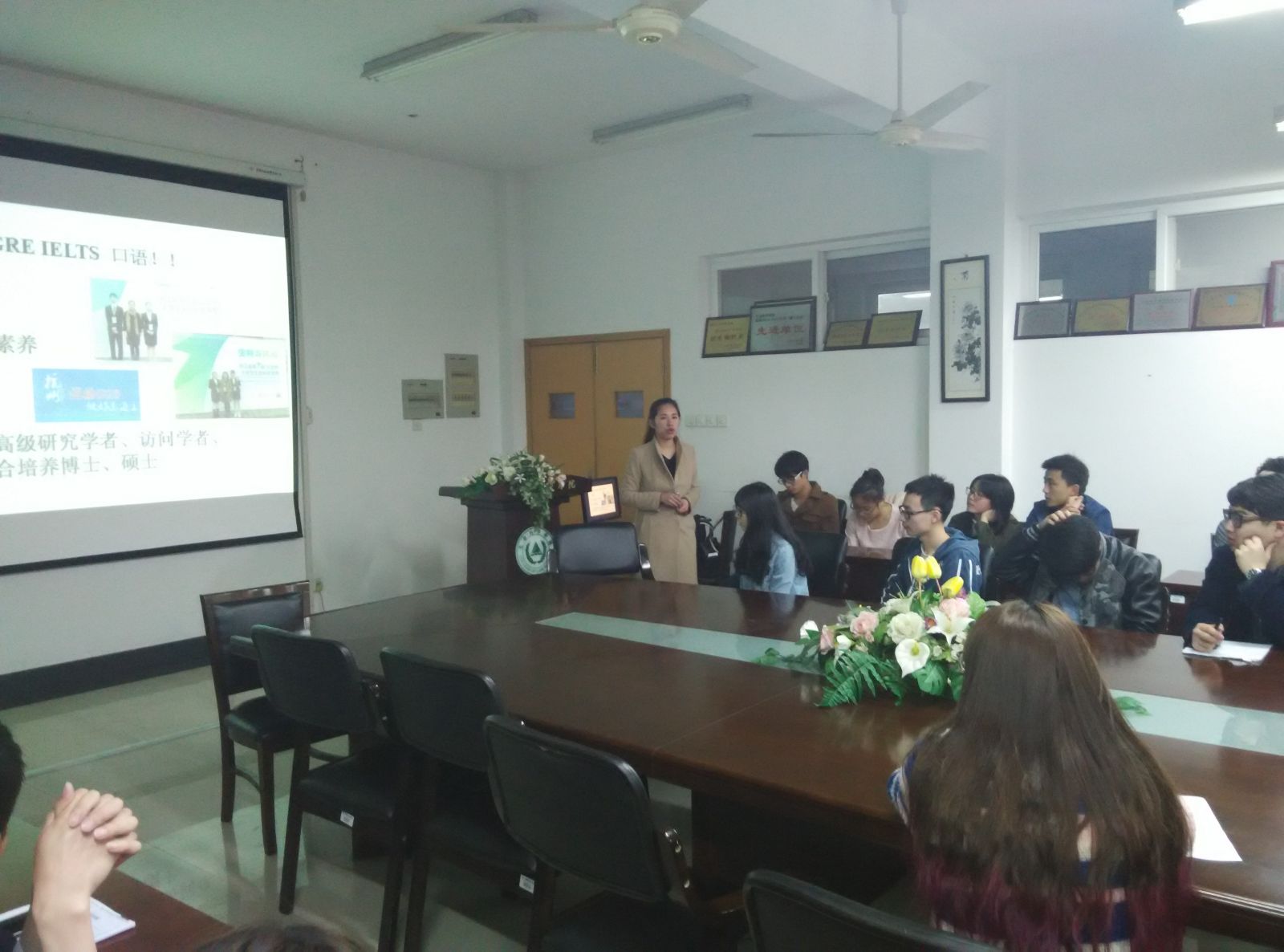 2016年4月5日,以就業與考研為主題的“科習沙龍”活動在格北210順利舉行,由12食品2班班主任蔣晗老師主講有關出國的一些經驗和經曆。同時邀請到了2016屆畢業生陳詩詩、陳亮、王朝峰為我們分享他們考研考公的經驗和一些心路曆程。方結紅老師參加了此次活動。